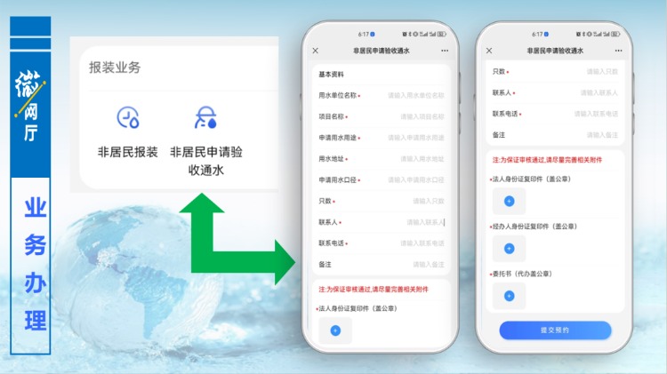 當(dāng)用水施工完成,達(dá)到通水條件,用戶同樣可在“微網(wǎng)廳”中,辦理驗(yàn)收通水申請(qǐng),填寫相關(guān)信息,上傳附件,提交預(yù)約,后臺(tái)工作人員會(huì)主動(dòng)聯(lián)系用戶,進(jìn)行驗(yàn)收通水。